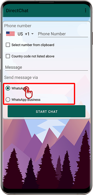5. Start Chat: Tap the START CHAT button. The app will open WhatsApp and create a chat window for the number you entered.